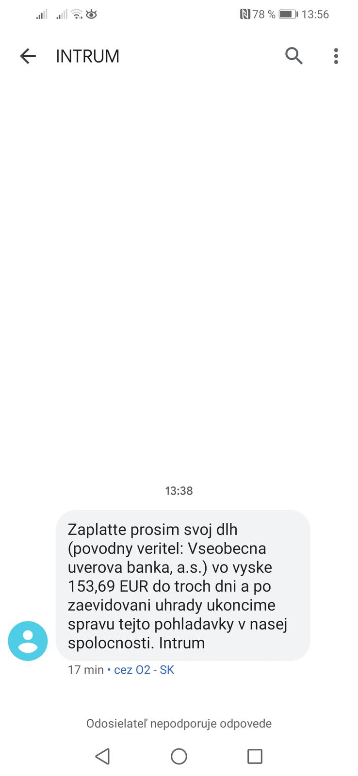 Ja sice nemam slovensku banku ale nam tiež prišla smska tu v spanielsku z "nasej banky" ze nasa karta bola zablokovana a bol tam odkaz na nejaku stranku kde pytali peniaze za odblokovanie. A bol to podvod. Pretože je korona a každy skuša čo može a kto sa necha odžubať. Smska prišla pod menom banky ale ked sme pozreli vsetky smsky z banky tak chodili pod uplne inym menom. Takze podla mna nieje problem spravit podvod v mene intrum. 🙂