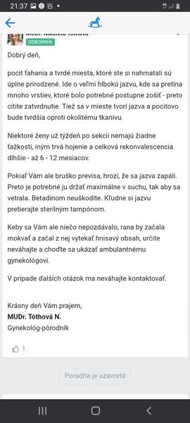 Ahojte, som 10 dni po sekcii. Nad jazvou mam opuchnute pozdlz jazvy/ taky ako keby trosku previs. Ked si chytim to opuchnute tak citim take tuhe, tvrde pod kozou. Je to v poriadku v procese hojenia? Inak jazvu nemam zapalenu a vyzera dobre, len ten opuch nad nou ma trapi