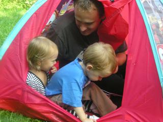 Včerajšia grilovačka dopadla super,počasie vyšlo,torta všetkým veľmi chutila,decká sa vybláznili,aj spolu sfukovali sviečku. 😀 Maťo dostal od kamarátky stan Mc.Qeena,tak sa nám v ňom schovávali a jašili sa tam.hrozne boli zlatý,čo robil jeden,to aj druhý.Keď Dominika spadla,hodil sa o zem aj Maťo,keď jedol Maťo kukuricu,jedla aj ona.. 😀