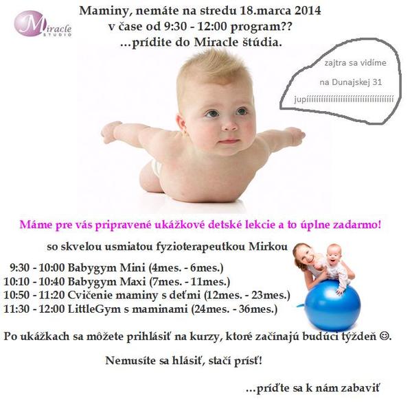Maminky, chcela by som vas zajtra pozvat na cvicenia pre deticky k nam iba za polovicnu cenu.