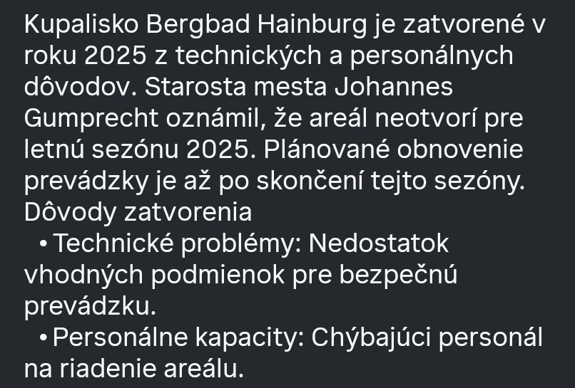 Rozhodol tak starosta Hainburgu. Dôvodom sú pretrvávajúce problémy s chlórom a nedostatok kvalifikovaného personálu.
