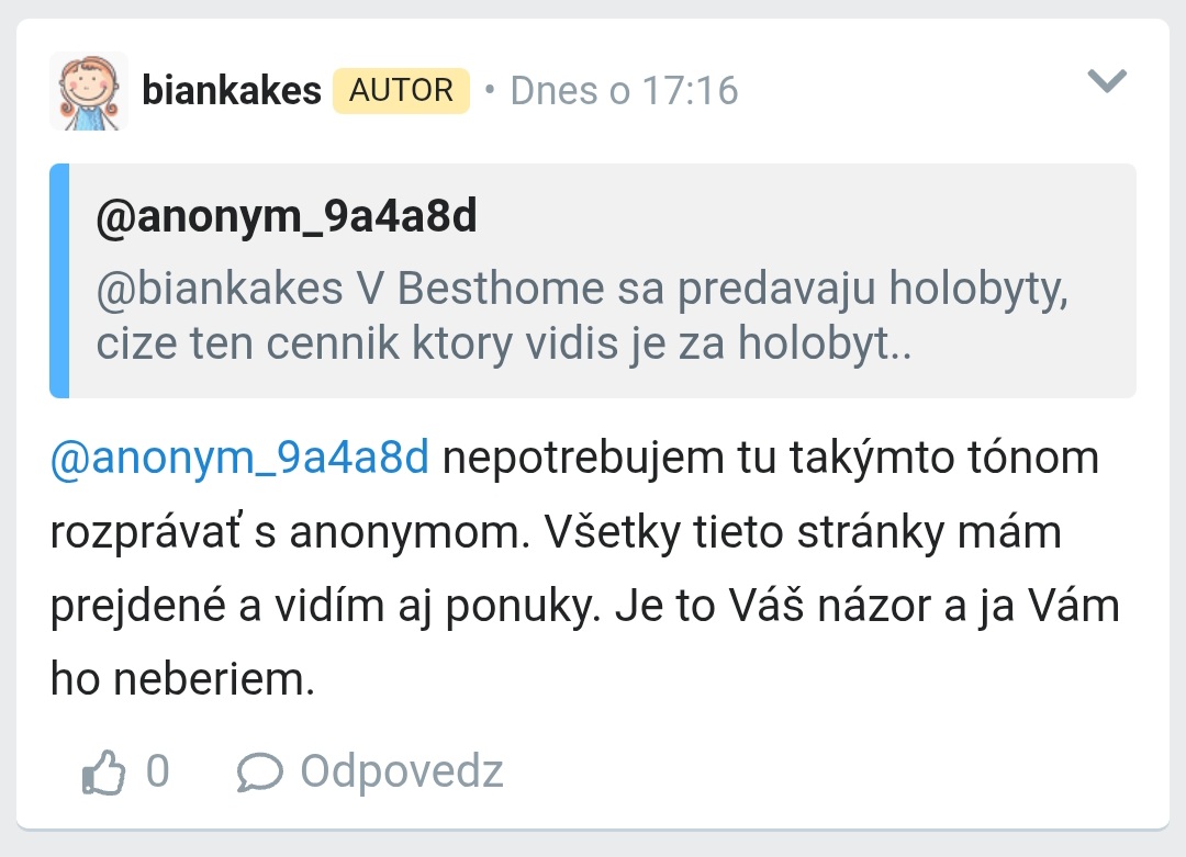 @toccara Ved ano, pyta sa a ked som jej uplne normalne odpisala, ze ceny v Besthome su za holobyty, kedze chce byt do 200 000e a tam vraj taky nasla, tak reagovala utocne a absolutne z cesty 😅. Pozri sa tu: