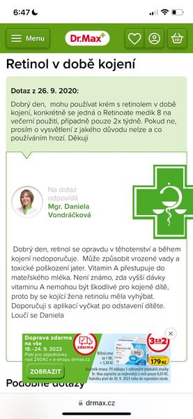@panda21 retinol je jedna z dvoch najpreskumanejsich ingrediencii v kozmetickom priemysle, ale ziadna studia nebola robena na tehotnych zenach, bolo by to minimalne neeticke... Tato studia bola robena na mysiach, ale je casto spochynovana, kvoli mnozstvu a koncentracie pouzitej latky... Vo vseobecnosti sa ale v tehotenstve neodporuca, i ked je to celkom vtipne, lebo taky vsade masovo pretlacany bioil urcite mnozstvo retinolu obsahuje a zeny si ho vo velkom noekolkokrat denne capu na brucho... Co sa tyka kojenia, to mas pravdu, tam uz zena nie je obmedzovana nicim, pokozka nie je spongia...