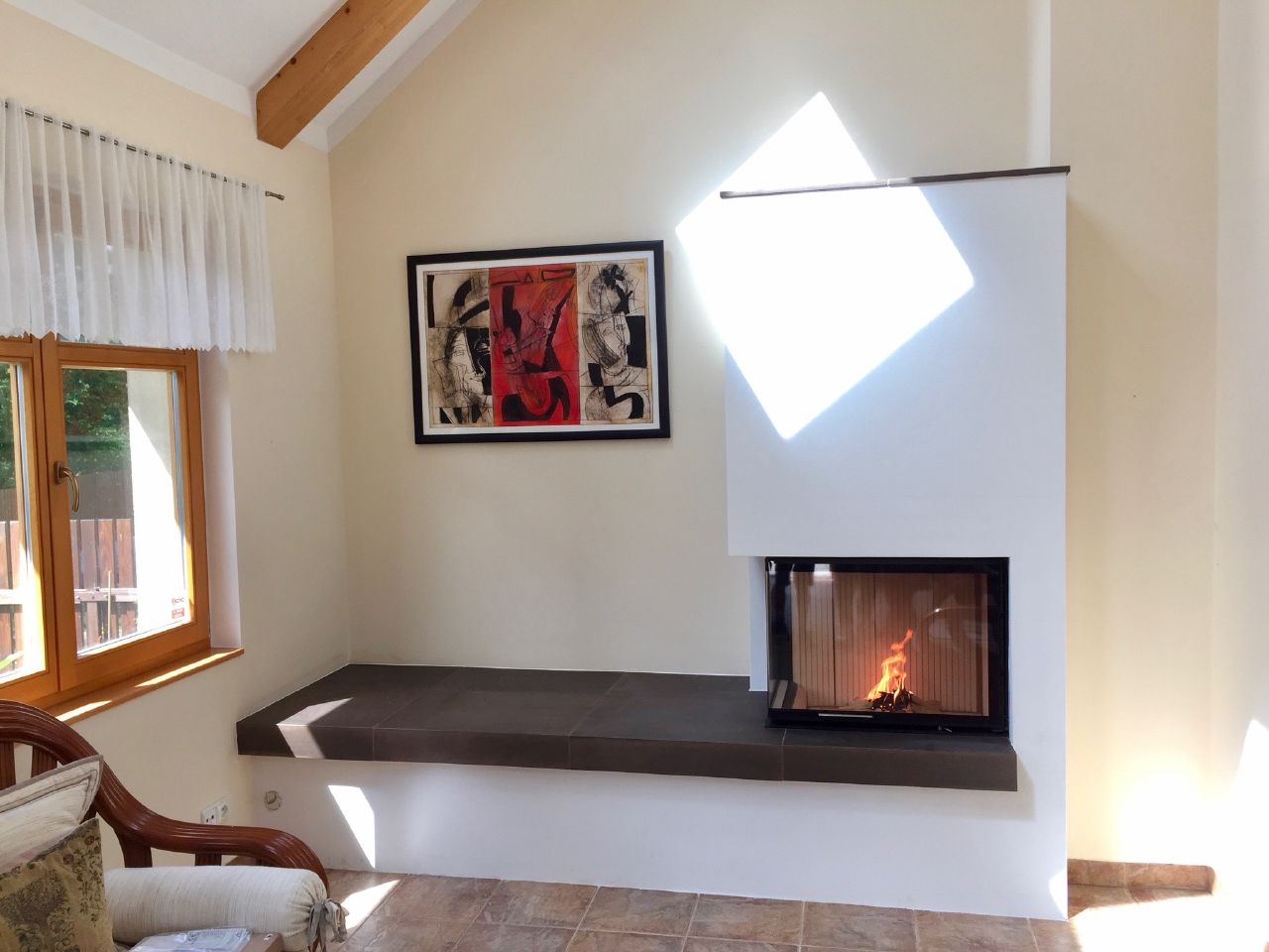 Kvet ti pri krbe zhori pravdepodobne, skor by som tam dala nejaku lavicu/kreslo na citanie.