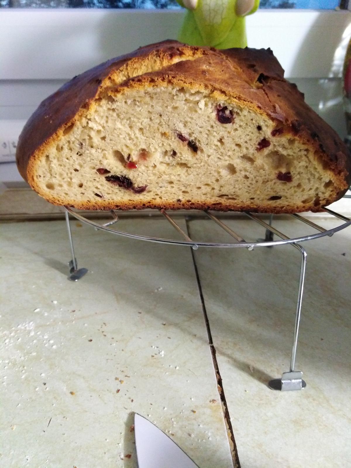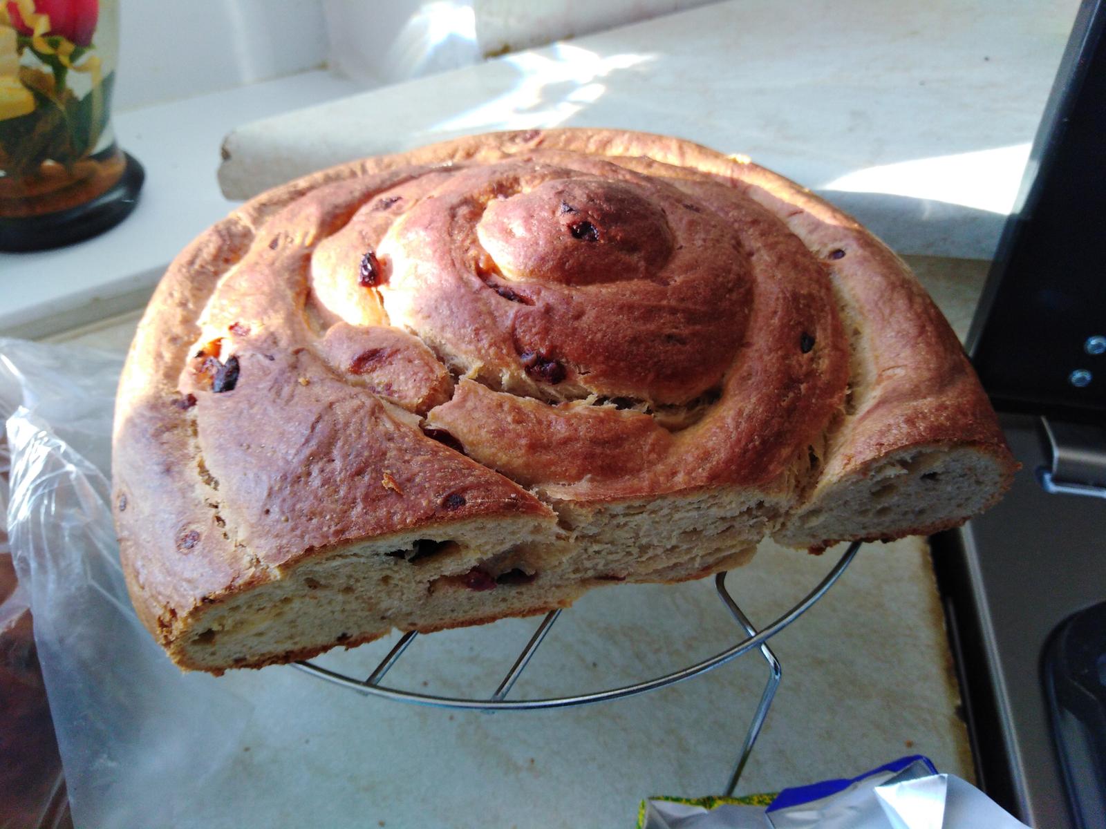 Moje presvedčenie je, že akékoľvek sušené ovocie má ísť do receptu, či už sú to hrozienka, alebo mandle, vždy sa to dá "vytunovať" verziou "máčané v čokoláde" :D takže v našom prípade išlo o čokoládové brusnice. Vyskúšala som dva tvary, jeden bochníček, jeden slimák. Múku som použila len špaldovú. A opäť som zapojila do výpomoci tibi kryštáliky.