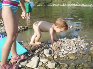 Jinak taky ho nechávám venku na hřišti lézt po čtyřech - za ruce nechce - hned si sedá a vyráží po čtyřech, a v náruči se mu nelíbí. Boty teda má, ale spíš jako ochranu ponožek proti namočení.