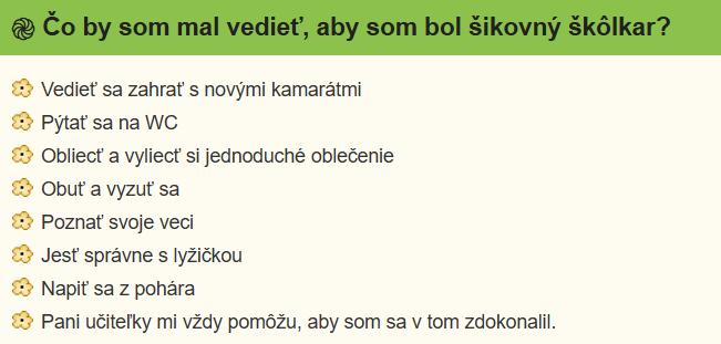 @anonym_autor to velmi zavisi , pri com dokazu ucitelky prizmurit ocko. Nam kazali , ze maju byt odplienkovani, vediet komunikovat, vydrzat bez mamy, vediet si aspon niektoru cast odevu obliect, trochu jest a pit z pohara. Vsetko toto dokazu prehliadnut, ak s dietatom nie je vela prace. Akonahle je zivsie, uz je problem ( aspon u nas), lebo " mame tu aj ine deti".