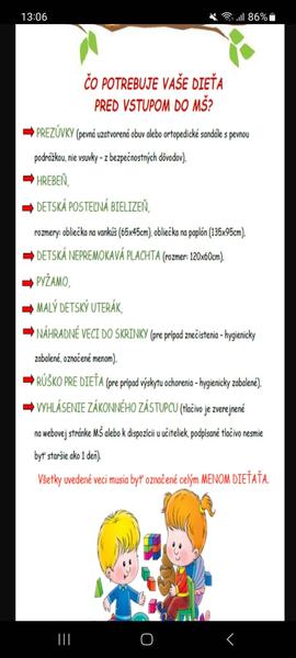Základ sú papuče a veci na oblečenie. Zvyšok má každá škôlka inak. Ak sú v núdzi treba pozisťovať na čo má nárok.