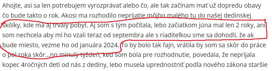 Plne rozumiem, tiež nám prišlo už druhé rohodnutie o neprijatí do škôlky, syn mal vo o februári 2 roky.U nás v obci škôlka nie je, takže som dala prihlášky do susedných, no a samozrejme sme úplne na konci pri výbere, keďže tam nemáme trvalý pobyt, ani súrodenca, čo uprednostňujú pri výbere. Ešte nám zostáva okresné mesto, ktoré je 5 min od nás, tam sú 3 pracoviská pod jedným zriaďovateľom, ale neviem, neviem. Súkromná škôlka je tu na okolí...jedna. Veľmi žiadaná. Čiže netuším, ako to dopadne a hnevá ma to, lebo síce nová legislatíva myslí na 400+ eur, ale nemyslí na to, čo na to povie zamestnávateľ. Okrem toho tu panuje názor, aký máme luxus byť tak dlho doma s dieťaťom - ale odhliadnuc odo mňa aj moje dieťa by sa už potrebovalo socializovať, vidím to na ňom. Nehovoriac o tom, že niektoré deti, ktoré vzali a chodia s ním napr. na ihrisko, hoci sú aj o pol roka staršie, sú vývinovo za ním... to ale nikto pri prijímaní neskúma, primárny je vek.