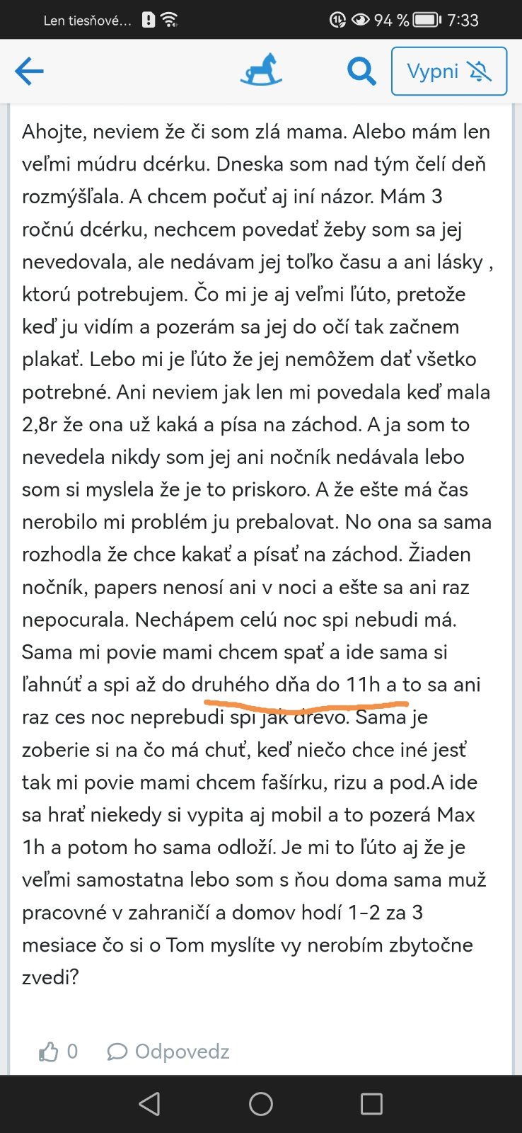 @mina0202 ale to mas velmi zle naucene ze spi takmer cele doobedie. To bude horror ked bude chodit do skolky skoly . Bude mat mega šok. Bude mrzuta neprebudena unavena. Fakt ty si rodic ty mas nejaky ten rezim nastavit. Nie ze bude spat do 11am a jest co si len za chce z chladnicky a robit len to co ju bavi . Je to take lenive. Ze ona si zije akosi podla seba Podla svojho 3r rozumceka a tebe to tak vyhovuje. Ty posluchas ju nie ona teba . Ona rozhoduje o vsetkom Akoby bola dospela osoba. Ona nie je dospela a nevie co pre nu najlepsie. To mas vediet ty. A zavadzat aj nepopularne pravidla. Inak ta nikdy nebude respektovat a bude fakt samorast bez vychovy. Mozno ti vyhovuje ze tak dlho spi ty si zatial porobis okolo zvierat pc upraces.. no nie je to dobre pre nu.