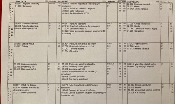 Napr. dnesny jedalnicek: desiata - cerealna kaiserka, maslo, zelenina, mlieko; obed - borsc, treska na masle, zemiaky, napoj, ovocie; svacinka - chlieb, zeleninova pomazanka, caj.