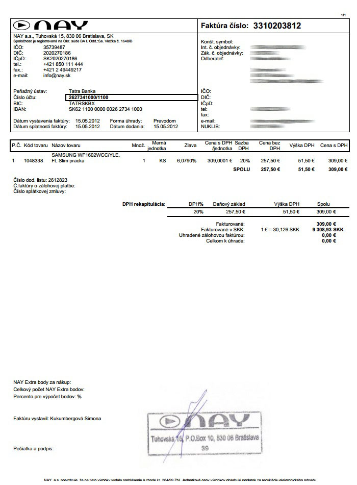 Ešte k recenzií som zabudla údaje o nákupe, takže dátum bol 13.5.2012, miesto: kúpené cez internet, myslím že práčku doviezli zo zlatých pieskov, aspoň som to malá nastavené pri objednávaní,a číslo faktúry je: 3310203812