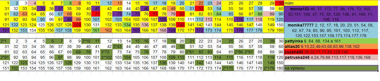 Ahojte, mám kartičky 31, 43, 46, 53, 54, 57, 59, 70, 98, 104, 107, 123, 132, 153, 164. Ak niekto potrebuje, dohodneme sa, ktoré potrebujeme zase my 🙂