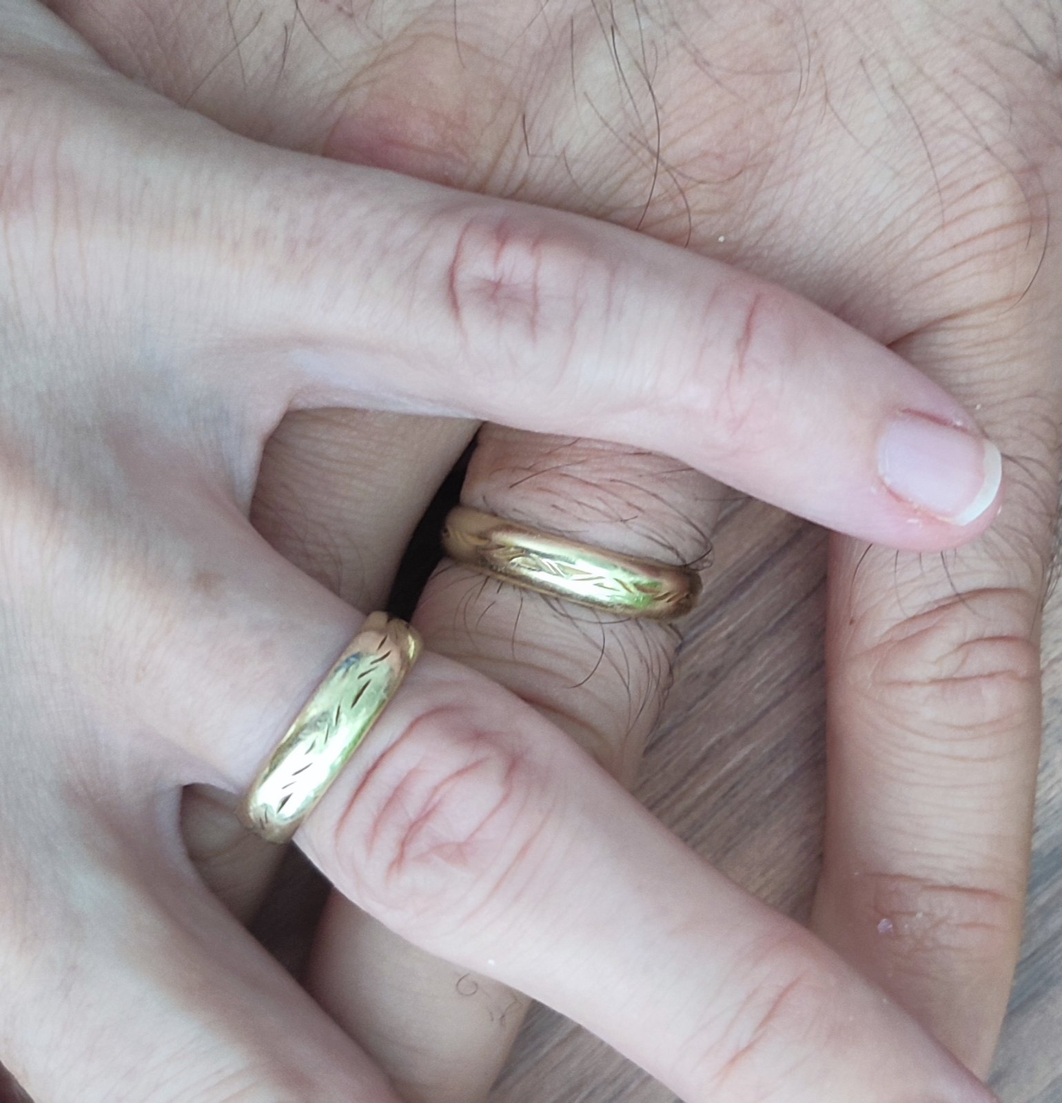 To sa mi az tak nevadilo, horsie boli, ze boli široké a po kazdom umyti ruk zostával pasik pod obruckou vlhky a po par umytiach bola koza rozmocena. Ano, mohla som ho stiahnut, umyt sa a utriet a potom navliect. Bala som sa, ze ju niekde zabudnem. Po rokoch som ich dala prerobit na hladke zlate