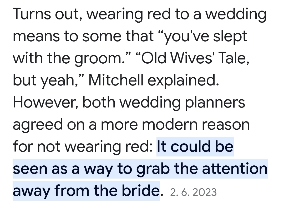 Okrem toho som už počula aj také "klebety", že červené šaty si dáva žena, ktorá mala pomer s ženíchom, ako takú provokáciu. Neviem, či sa to tak berie aj u nás, staršie ročníky asi nie, ale môže byť že mladší multi-kultútny ľudia to už tiež zachytili.