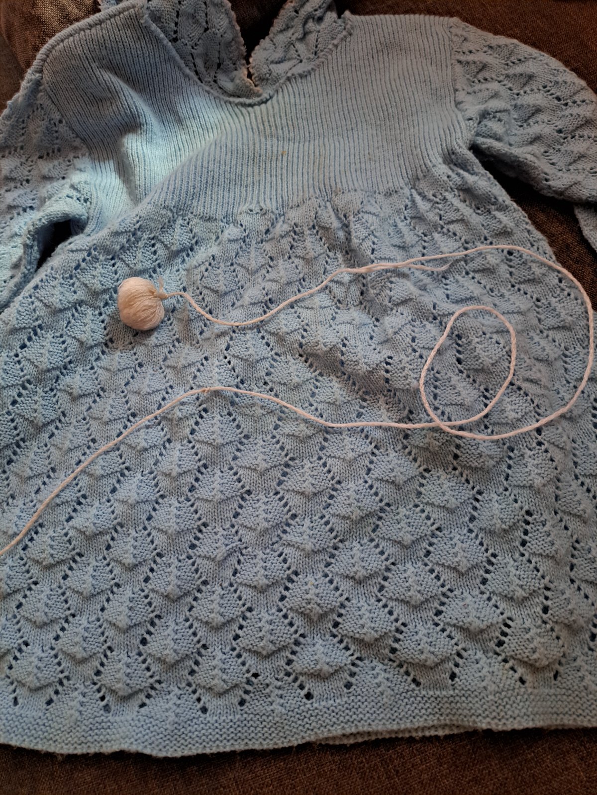 A nie je jednoduchšie kúpiť nejakú peknú stuhu a urobiť nové viazanie? Veď to už ani pekne nie je. Alebo na boky toho svetríka naši, uháčkuj pútka a prevleč cez to.