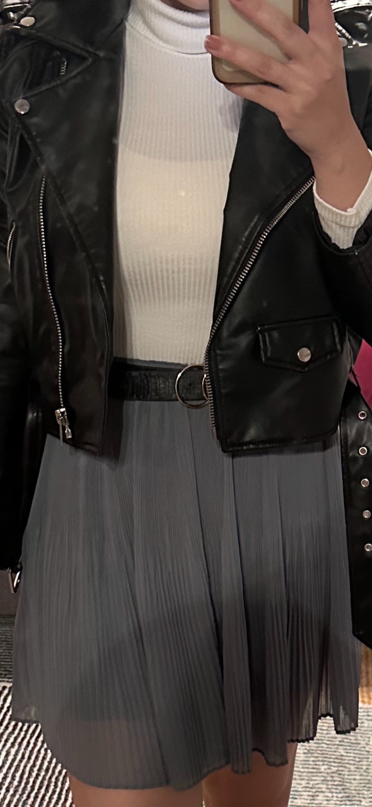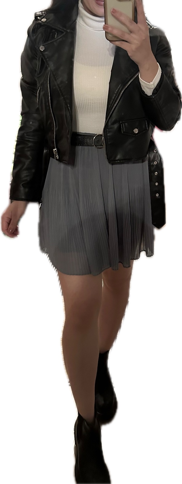 Niečo mi tam vadí, je to také rozhádzané. K roláku skôr kabát, alebo sako, tá krátka kožená sa nehodí ku krátkej sukni. Farba sukne by mala byť podľa mňa skôr hnedá ako sivá, je to moc studené a tieto čižmy skracujú nohy. K tomuto radšej jazdecké čižmy.