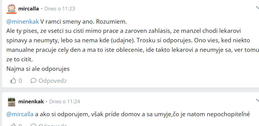 Ale ty pises, ze vsetci su cisti mimo prace a zaroven zahlasis, ze manzel chodi lekarovi spinavy a neumyty, lebo sa nema kde (udajne). Trosku si odporujes. Ono vies, ked niekto manualne pracuje cely den a ma to iste oblecenie, ide takto lekarovi a neumyje sa, ver tomu, ze to citit.