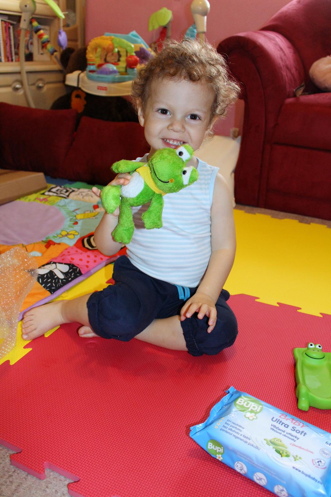Po jej otvorení nás tam čakalo veľké prekvapenie 🙂 . V taštičke sa nachádzalo veľké balenie umývacieho gélu a umývacej peny, veľké 64ks balenie vlhčených utierok, plyšová žabka a podložka pod mydlo. Našťastie krpci si to bez problémov rozdelili a nenasledovala hádka o hračku. Malý prvé dni spával s podložkou pod mydlo 😀 .