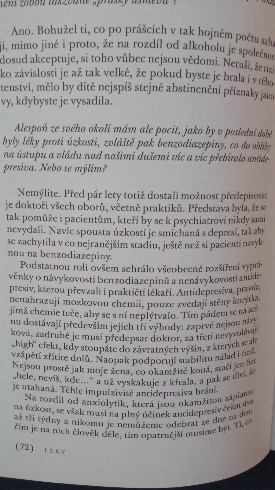 @sandra2308 mňa sa pýtaš?áno, keď som brala 20 mg Seroxatu nebol žiadny problem, nebola som unavená, nestrasili ma otázky a čo, keď....tu je kúsok z tej knihy je to celé štýlom otázka redaktorky odpoveď lekára....ako čo funguje, ako na to, keď nás štve šéf, svokra, muž netreba lieky, ale dlhodobú terapiu a nazrieť do svojho vnútra, je tam aj čo to o výchove vzdor deti, že muži skôr pijú ženy tabletkuju, podľa lekára veľa ľudí nepotrebuje AD a Lexaurin, ale byť skromný, veľa spat a nemať nereálne predstavy o živote, sebe