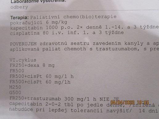 A dnes som si pozrel jeho zaznam, v ktorom sa pise, ze mu zdravotna sestra ma aplikovat chemoterapiu s trastuzumabom.....a nakoniec sa tam pise: fr 250+trastuzumab 300mg/1h NIE JE