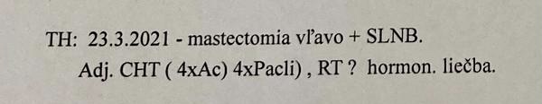 Pred operáciou mi teda onkologička povedala, že aký bude postup, vraj to vyzerá tak že po operácii bude nasledovať chemoterapia, 6 ciklov - 3x FEC - 3x docetaxel, potom liečba ozarivanim