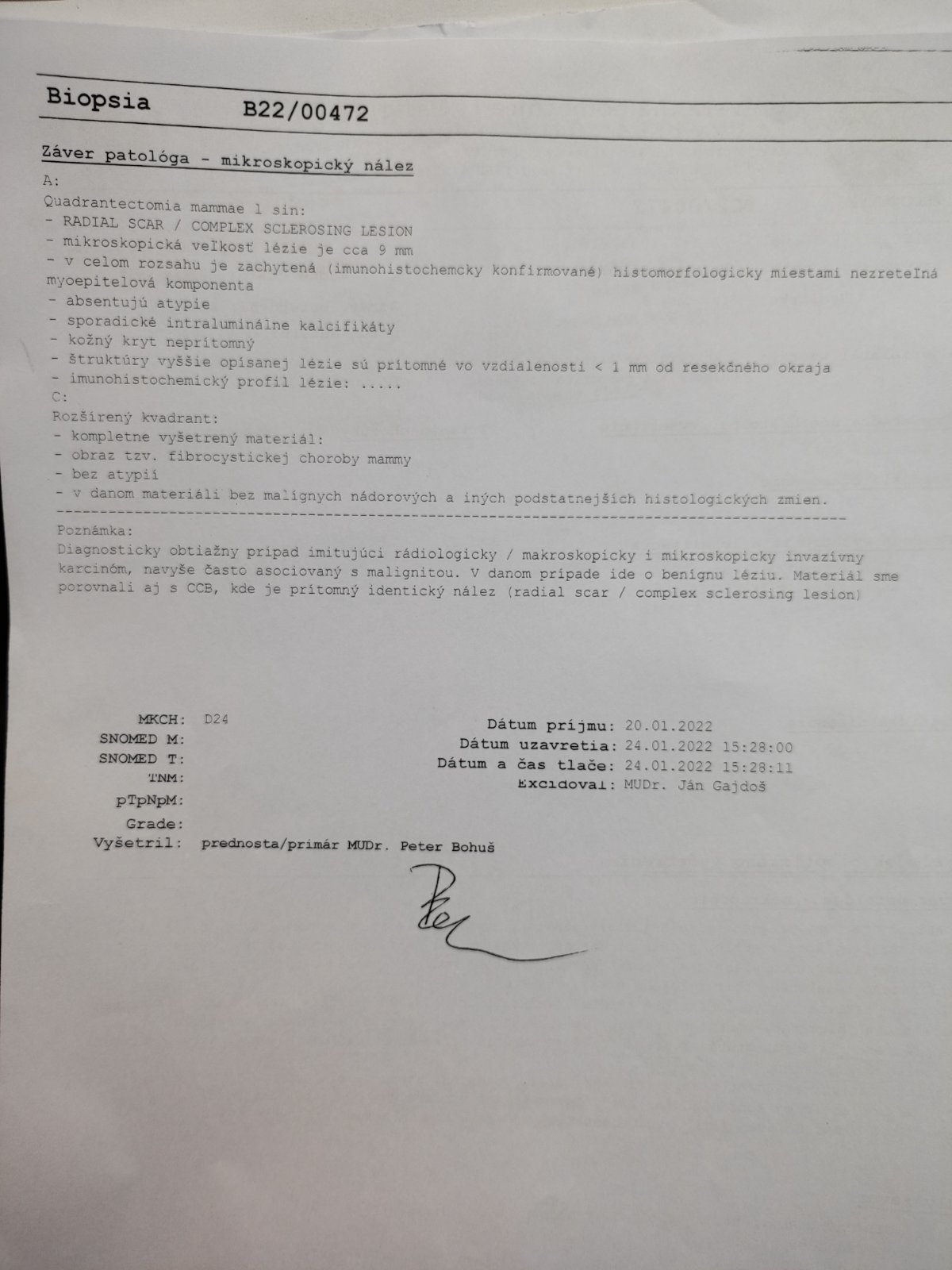 @helga9 v istej fáze sa bunky na core cut biopsii môžu javiť ako zhubné... stáva sa to vraj vo veľmi ojedinelých prípadoch... takže vyzerá to tak, že bola mylne vyhodnotená biopsia.... lenže ja som mesiac v podstate zmierená s tým, že to bolo zhubné....ja neviem čomu mám veriť.... je to síce vynikajúca správa, ale bojím sa jej veriť. Zajtra idem na onko, uzavrieť to,tak možno mi vysvetlia ako to je možné. Dievčatá,som viac zmätená než šťastná,🤷