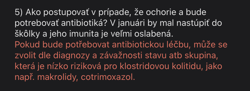@andruska7 tu je odpoved od infektologa detskeho z brna. U mna ale makrolidy klostridiu vyvolali. Ja si myslim, ze ziadne nie su nizkorizkove. Skor skuste zvazit ci si nepopytate dvojkombinaciu s entizolom. Urcite by som uzivala aspon vysoke davky enterolu pocas liecby. Biseptol, ak by bola vasa bakteria nam citliva mozem potvrdit, ze klostridiu nevyvolal spat. Drzim palce