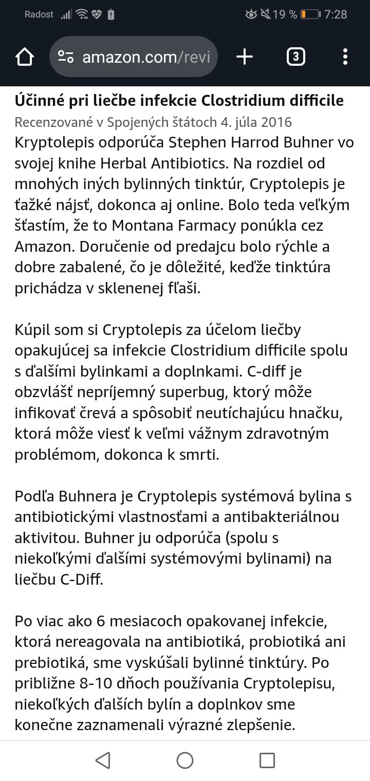 Ahojte. Pridávam foto toho čo mi pomohlo. Hoci som si nie istá či som mala teraz znova c. diff nakoľko som sa netestovala ale za mňa áno. Stolica po týždni užívania sa upravila na úplne normálnu vo všetkých smeroch a stav pretrváva aj naďalej. Ešte dodám, že ide o alkoholové tinktúry, tak som sa bála opačného efektu,kedže alkohol podporuje rast spór