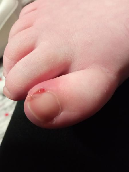 Juj to musi riadne boliet. Skoda, ze ste na chirurgii neboli dnes. Je to zarastajuci nechet. Betadine na dezinfekciu, vytlacit hnis, ak sa da, kusocek gazy s Betadinom vlozit pod nechet.
