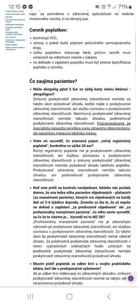 Inak čo čítam to je asi už bežná prax čo ty lekári, môj manžel bol minulý rok u internistu skrz povinných predoperačnych vyšetrení a tiež normálne od neho vypýtal 15 eur, že ročný poplatok
