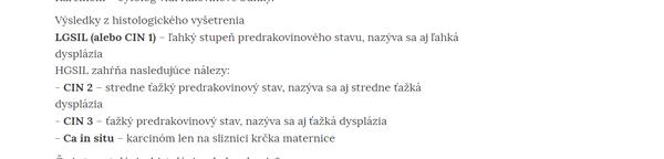 Neviem si ale stále vysvetliť aký stupeň vlastne ja mam, keďže sa tam písalo o strednetažkej až ťažkej dysplazii a diagnóza je karcinóm in situ inej časti krčka maternice? Tak vlastne aký stupeň u mňa bol zistený? Môj gynekológ mi povedal ze HPV mám a že sa nedá vyliečiť,keďže som to nikde vo výsledkoch nemala uvedené tak som sa ho pýtala a on že to je ako s herpesom... Ani mi neporadil nič, že napr.posilnovat imunitu alebo proste niečo. Začala som piť smoothie a kúpila indonal. Čo ešte radite?