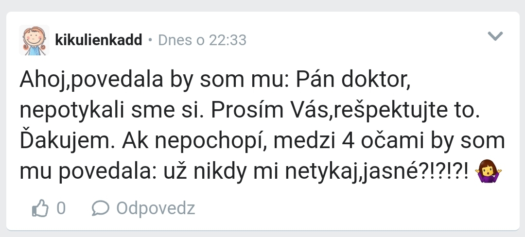 Autorka:znovu. Si dospela, vyzadujes vykanie, tak sa ako dospela spravaj. Cize do buducnosti: prosim netykajte mi, uprednostnila by som vykanie. Dakujem. Usmev k tomu a vybavene 🤷♀️