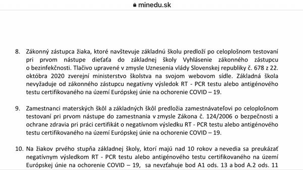 Materská škola, ani základná škola nevyžaduje od zákonného zástupcu negatívny výsledok RT-PCR testu alebo antigénového testu certifikovaného na území EÚ na ochorenie COVID-19.
