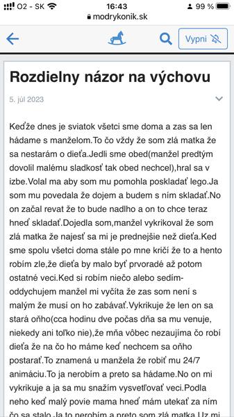 @miriam11 Ale zivot s takym toxickym clovekom, ako je jej muz, je na mile vzdialeny od normalnosti. Ta zena ma k tomu cloveku zavisly vztah, nesprava sa ako bezny partner. Nema ziadne hranice, sebahodnotu a sebavedomie - to sa odraza na vsetkych jej vztahoch - napriklad k detom a suvisiacich problemoch. Ale odist evidentne nechce, len sa tu pride vyzalovat a potom napise inu temu. Nema odvahu vziat svoj zivot do svojich ruk, nema odvahu spravit ani male kroky v jej zivote. Je to jej rozhodnutie. Je mi to luto, odide v buducnosti, ked to toxicke spravanie sa prenesie aj na syna a uz to nebude unosne.