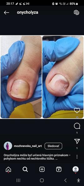 Celé to treba vystrihať odbrúsiť celú tú časť ktorá je uvoľnená a nedrží nechtová platnička i spodok.... a potom natierať A natierať a natierať a čakať niekoľko mesiacov skoro rok kým odrastie celý necht a stále natierať ale vmasírovaním.