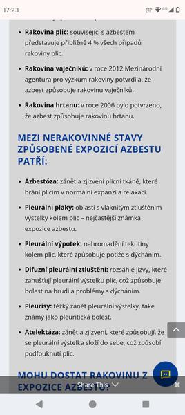 @mamina7070 rozvíril ho do ovzdušia a on o chvíľu popadal na zem. V Rusku kde bola fabrika na azbest predávali na trhu jablká a zeleninu pokryté bielym prachom. Mali tam cele mesto s tým zamorené. Azbest nie je karcinogénny ako taký, chemicky. Nebezpečný je jeho tvar mikroskopických ihličiek ktorý poškodzuje pľúca na hĺbkovej úrovni nie len niekde v prieduškách ale ide až do aveol. A tieto poškodenia potom vedú k možnej rakovine. Rovnako je to so sklenenou vatou ale tá je väčšia nejde tak hlboko a ľahšie sa zachytí už v nose a horných dýchacích cestách. My sme mali v chatke na zahradke ako deti azbestove obloženie okolo piecky aj azbestový prechod do komína a utesnený azbestovým povrazom. Ešte do nedávna sme to tam mali. Kym do toho nik nešupal tak to bolo neškodné. Problem je že autor to rozbíjal. Ale keďže sa toho nadýchal len raz nemusí sa báť. Kaderníčky majú problém že sa nadýchajú pri strihaní mužov mikro ulomkov vlasov. Po veľa rokoch majú niekedy problém s pľúcami. Ale nie je to také mikroskopické a ostré ako azbest. Podobne učitelia majú problémy z kriedy školskej, baníci z uhlia.
