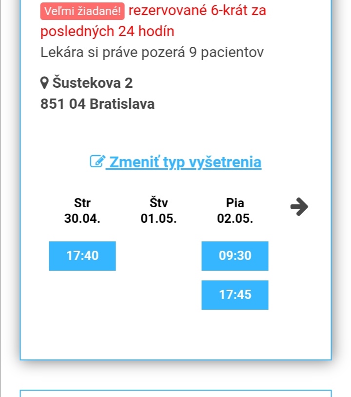 @elenita Ako to funguje? Nasla som na danu specializaciu 3 doktorov v mojom mieste. Viem akurat kliknut, ze chcem byt informovany ak dana lekarka bude mat volny termin. Ako na tej stranke postupovat?