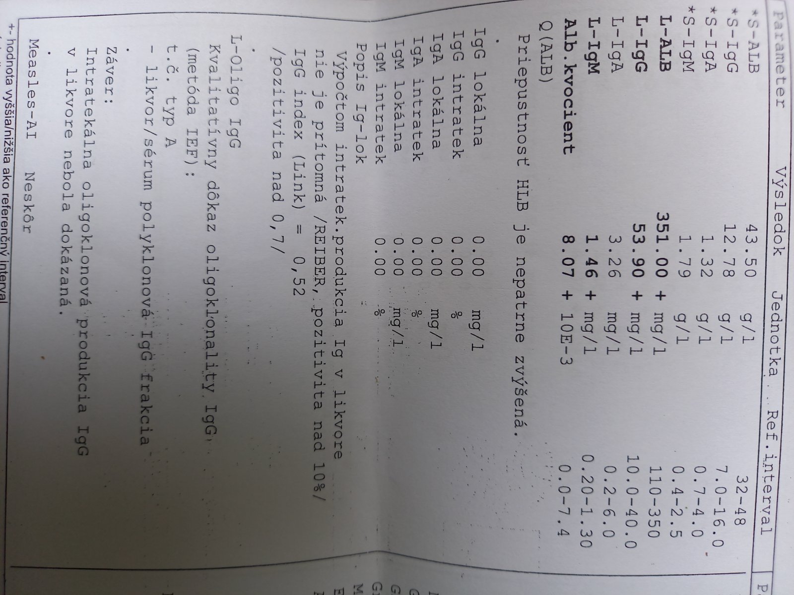 @huginko02 - no neviem či podľa tohoto sa dá určiť či to je sm. Pozerala som túto správu u mňa a ja som mala všetko v norme, vtedy aj uzavreli, že likvor je čistý. Ale na mozgu som mala viacero ložísk.
