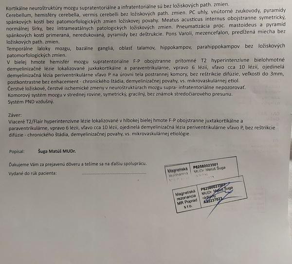 @cuculik1 ahoj, mne SM začala podobne ako tebe. Boli sme posledný deň pri mori a v deň odchodu som sa zobudila a videla dvojito. Musela som pobaliť celú rodinu a tváriť sa, že sa nič nedeje, aby nestresovali. Fungovala som so zažmúrenym okom aby som dobre videla. Dvoma naraz to nešlo ako tebe. Celú cestu domov mi nebolo dobre unavená som bola, tak som spala. Potom to prešlo a začala som vidieť normálne. Na očnom mi nič nenašli a tak som si pomyskela, že som len zle spala. No a po týždni sa to zopakovalo ale tak, že stav sa mi postupne počas dňa zhorsoval, bolo mi na vracanie a zasa som bola unavená. 3 hodiny som čakala u obvodnej neurologičky kým prídem na radu a keď som konečne mala ísť dnu, tak som vstala, hodilo ma do práva a zramovala jej celý stôl. Vyšetrila ma a povedala, že mám ísť na urgentny príjem a poslala ma preč. Volala som mužovi, prišiel pre mňa a kým sme prišli domov, bolo mi už fakt zle, začala som vracať tak volal sanitku a skončila som na urgente kde vyše 3 hodín nevedeli čo somnou. Stále ma napínalo na vracanie, bola som neskutočne unavená a chcela som len spať. Konečne ma umiestnili na JIS a od vtedy si nič nepamätám. Neviem co sa somnou dialo 2 dni. Stále som spala. Na 3.den prišla za mnou lekárka a povedala, že nič mi nedávali lebo stále nevedia co mi je a musím sa vzchopit a ísť na MR. Tak na 4.den ma naložili do sanitky a odviezli do inej nemocnice na MR. A keď som sa vrátila, povedali, že MR im neukázalo co potrebujú vidieť, tak musia urobiť lumbalku. Na 5.pokus sa im to podarilo, ale už potom nečakali na všetky výsledky lumbalky lebo to trvá aj 3 týždne a nasadili mi Solumedrol a antivirotika lebo nevedeli, tak pre istotu. Po Solumedrole asi po 2 dňoch sa mi trocha uľavilo a až po týždni mi povedali, že mám SM. Dvojito som videla ešte asi ďalších 5 týždňov a dodnes mám v jednom uhle pri pohľade vpravo dvojité videnie. Toto bolo v 2017. Mala som 40 rokov. Tiež mám 2 deti. 4 mesiace po prepustení mi nasadili liečbu liekmi a beriem ju dodnes. Neboj, všetko bude v poriadku, lumbalka ukáže všetko podrobné. Hlavne si hneď lahni na brucho a veľa pi. Je to dôležité aby ťa nebolela hlava. Držím palce a hlavne kľud lebo stres je nežiadúci a môže zhoršiť stav.