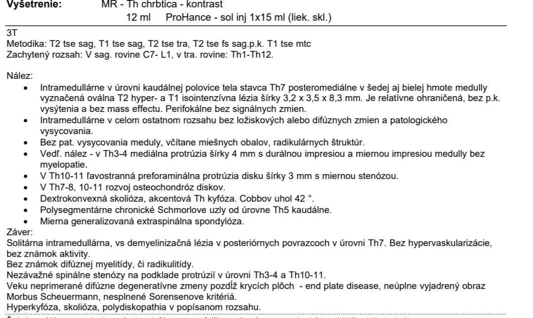 @123martin ahoj mozem sa ta opytat na nazor, ak by si vedel k tomu nieco povedat? Moze byt tato lezia brana ako SM? Na mozgu jedna lezia v regresii (nesplna kriteria pre SM), C chrbtica - miecha bez lezii a teraz Th chrbtica s dakou leziou (k tej by som sa chcela vyjadrit ak vies)..Vsetky MR robene kvoli zapalenemu ocnemu nervu (podla magnetickej, no podla očneho profesora Izaka som nemala nikdy zapaleny ocny nerv a to ma videl aj pred aj po liecbe solumedrolom)..chystam sa do SM centra ale kym sa tam dostanem 🤔 dakujem
