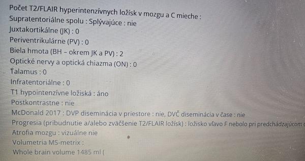 @jamka_bb ahoj, MR sken vyhodnocuju specializovani lekari. Ja nie som ani MRI lekar, ani neurolog, mozem len precitat co pisu. V zavere necitam, ze by tam bola SM lezia. Lezia tam je, je bez aktivity. Myslim si, ze az dalsie skeny v buducnosti ukazu, ci sa tvoria nove lezie, alebo nie. Ale posudit budu vediet v SM ambulancii. Nielen podla MR, ale aj podla dalsich vysetreni a posudenim tvojho stavu.