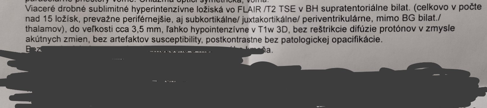 @gubcikova MR je zhluk nejakych skvrn v mozgu. Nie je lahke z toho jednoznacne urcit diagnozu. Lekari na MR to specialne studuju. Z toho zhluku sa vsak daju vycitat mozne diagnozy. Vsetky tieto mozne diagnozy potom napisu do zaveru za skratkou "dif.dg". Tych moznych pricin, preco mas svetle skrvny na mozgu je viacero, mas ich uvedene za skratkami "dig.dg", pripadne aj s odporucanim na dalsie dovysetrenie. Podla tychto diagnoz by uz neurolog mal vediet postupovat, ake dalsie vysetrenia su potrebne aby sa jednotlive diagnozy vylucili, pripadne potvrdila niektora konkretna z nich. Preto s tym vysledkom treba ist k neurologovi.