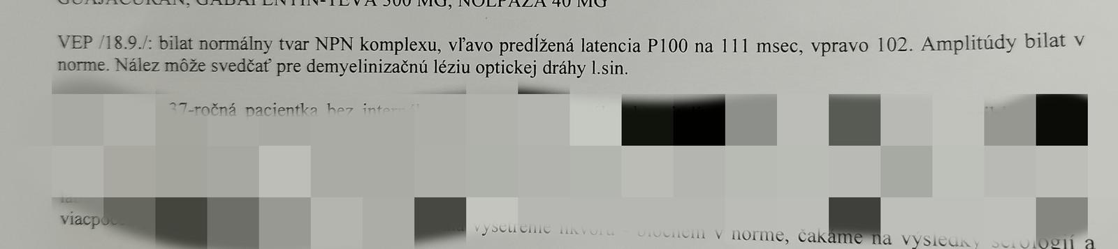 @blcha123 ďakujem. No prepustili má z nemocnice a mám čakať do 16.10. V závere napísali že VEP bez nálezu demylyzačných lezii a pritom na tom VEP je napísané že nález môže svedčať pre demylizačnú leziu. Oko má stále bolieva . Tak skúsim sa objednať na očné.