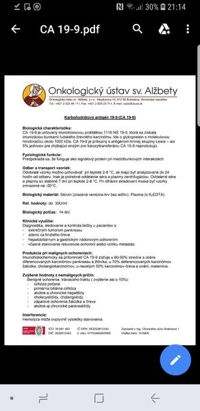 @katrin21 Ahoj. Tak u svojho gastra som velmi nepochodila. Na bolest pod pravym rebrom sa ma snazil presvedcit, ze je to pankreas. Zlcnik urcite nie, ze mi sono robil v juni a ze tam sa urcite nic nezmenilo. A s ladvinou si musim zajst za urologom. Plus mi vysiel jeden onkomarker zvyseny CA 19-9, o dve cisla...ty o tom nevies nieco viac...?viem, ze tu mas kopu prispevkov tak si ma napadla...Ach, ostala som znechutena. Ako vlastne boli pankreas?:( Neviem co s tym vsetkym vlastne robit. Vyse 2 mesiacoch mam zdrav.problemy a ziadny vysledok.
