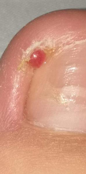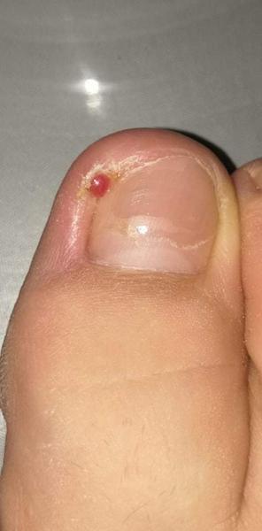 Zapálený nechtovy val , zarastený nechet, v dôsledku, malej obuvi a zle strihaneho nechta. Treba nájsť dobrú pedikerku, nasadiť šponu. Ale ak sa nezmení obuv, neviem či pomôže