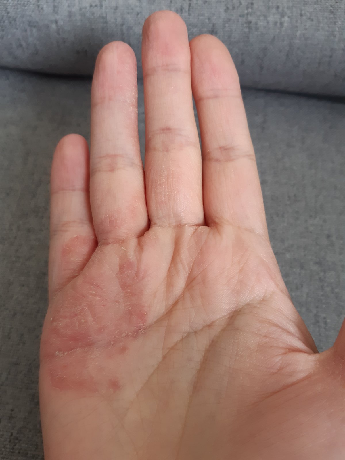 Na pravej ruke som už dlhšie mala také pupienky, ktoré buď praskli alebo vyschli. Myslela som, že je to dishydróza. Vlani niekedy v októbri to začalo byť horšie, mala som takú celú dlaň a teraz už mám dva menšie spoty aj na ľavej. To miesto je zapálené, aj horúce. Keď ich spoty držím hydratované, tak je to lepšie, ale nezahoja sa. Osvedčila sa mi najviac zo všetkého od prepísaných mastí, cez drahé krémy až po prírodné séra, Nivea. Ale to len na hydratáciu. Nechce sa to zahojiť. Nedajbože si zabudnem krém alebo som z domu dlhšie, tak mi to celé popraská, bolí to, nemôžem vystrieť dlaň. Nehovoriac o sociálnom faktore, hanbím sa za to ako pes. Dezinfekcia v obchode ani nehrozí. Doma pracujem už len v rukaviciach.
