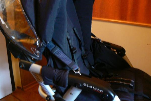 Já si to koupila, je to jen popruh a nakonci je karabinka - přeska jako např. u zimních kombinéz - na jedné straně ten hřebínek a na druhé straně díra, kam se ten hřebínek strká. Mám od ní i návod, ale jen na X lander, prý Slalom nemá nafocený, ale maminy to kupují...fakt to ale není kam upevnit.