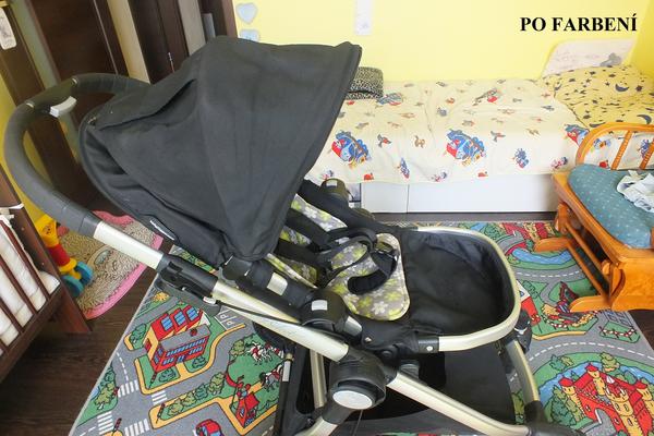 Včera mi akurát prišiel kočík a tiež bola farba vyťahaná od slnka prečítala som si tento blog a manžela som poslala kúpiť do baumaxu, no mali tam už len jednu poslednú farbu stála 6 eur, tak som zháňala na intternete kde sa dá kúpiť,tak som našla tu je link a cena je lepšia iba 4,50 http://www.bugy.sk/search/?search_string=Dupli+... Dnes som vyskúšala nastriekať jednu striešku, (mám dvojkočík) jedna plechovka farby mi stačila na jednu striešku tak som si objednala ešte 4 plechovky, pretože je vyblednutý všade...... No a po hodine som skúsila tú striešku a tá farba je pekná čierna, ale ten materiál mi príde taký drsný na dotyk už to nie je ten materíl čo bol, ale vypadá fakt ako nový....už ako sa sami rozhodnete...... 🙂 😉