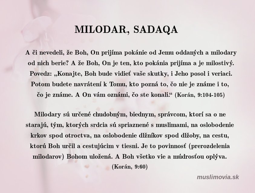 @lenkakravcova tu by som sa zastavila nad významom slová sadaqa - v Bosne sadaqa znamená, dáš keď môžeš, keď chceš pomôcť chudobným, tym co nemajú....napr.ides do obchodu, vydis prosiaceho, dáš mince, keď chceš.. A vitre sa dávajú na koniec mesiaca posta a toto musí dať každý moslim... Čiže v tomto článku je napísané, že - je to povinnosť...v Bosne slovo sadaqa neznamená, že musí, že je povinnosť.. Len chcem poukázať na to, že preklady sa všade berú inak, a niekedy vedia zmiasť diskutujúcich ľudí...